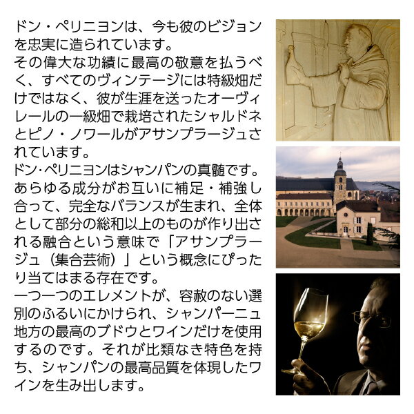 ドンペリニヨンは、今も彼のビジョンを忠実に造られています その偉大な功績に最高の敬意を払うべく、すべてのヴィンテージには特級畑だけではなく、彼が生涯を送ったオーヴィレールの一級畑で栽培されたシャルドネとピノ・ノワールがアサンプラージュされています。